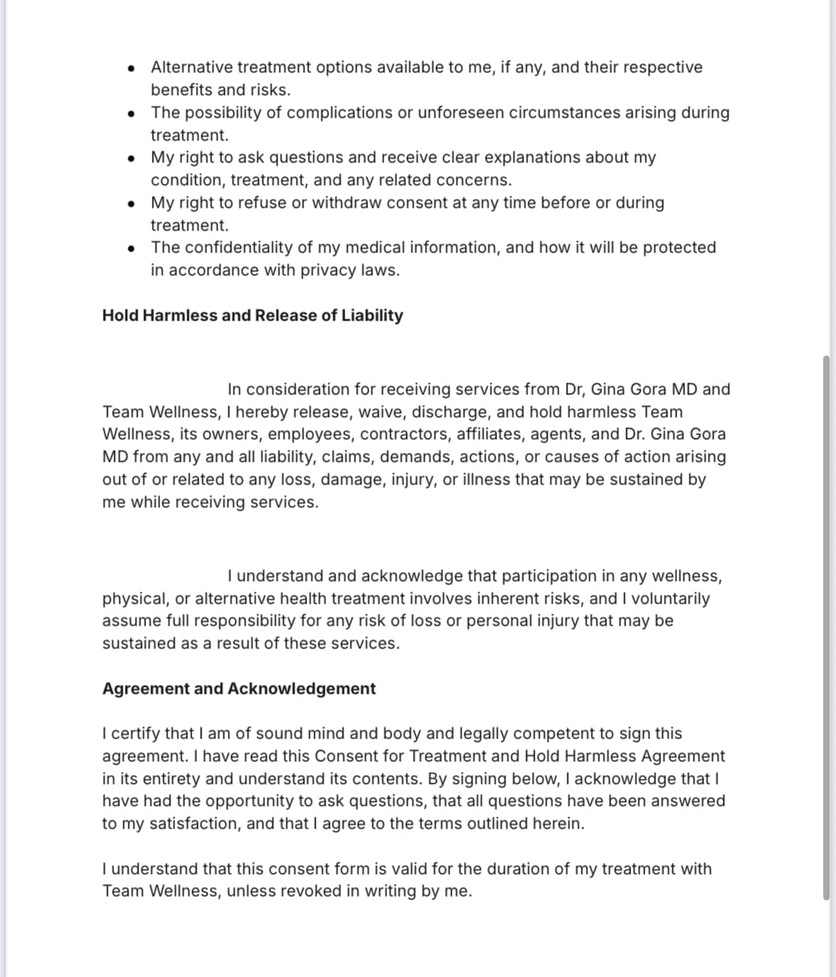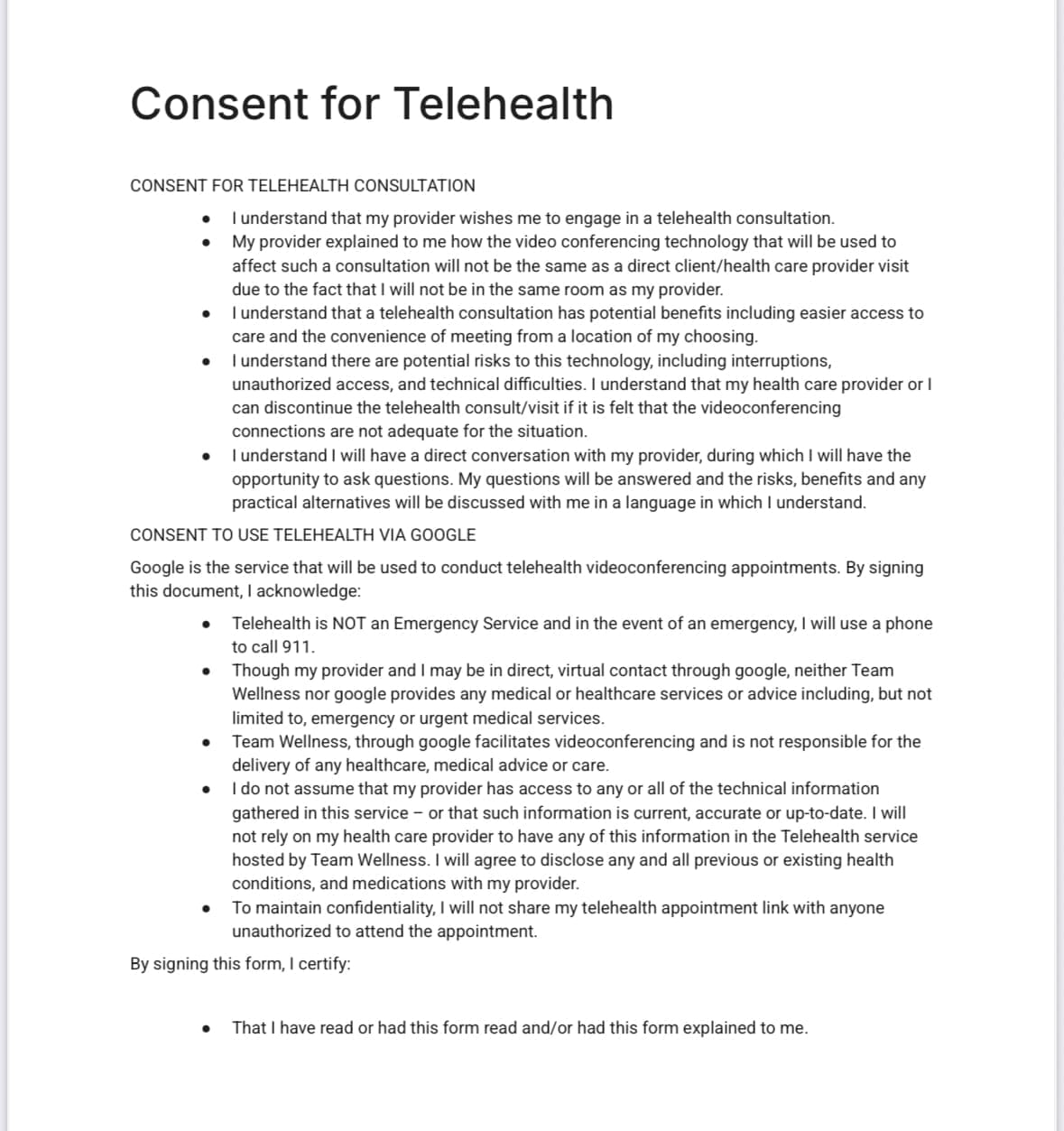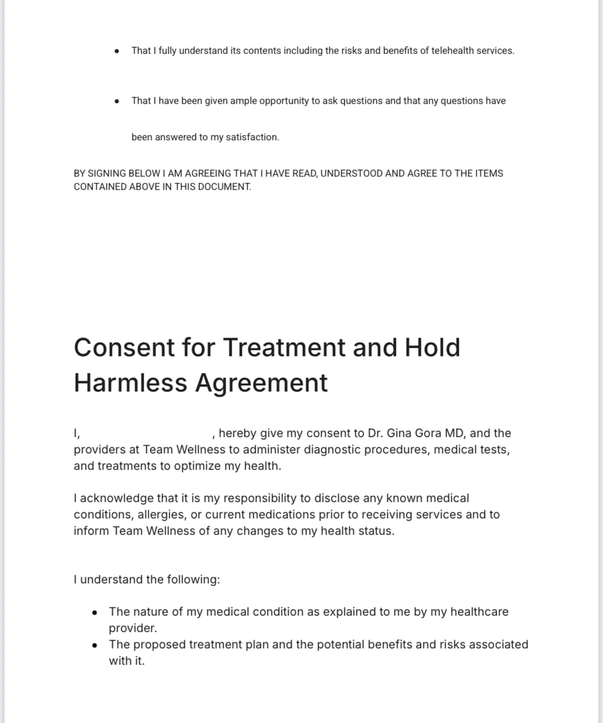 submitting information electronically consents to Treatment with Team Wellness, and the treating physicians